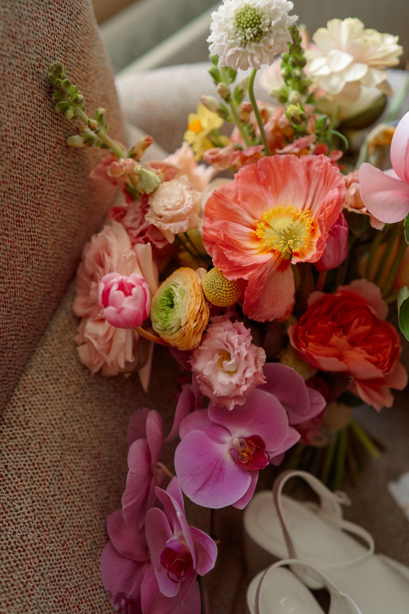 I’d describe my work as modern, colourful and feminine. I love working with luxe fresh blooms and a range of colour-ways, from candy and cerise pinks to lime and lipstick red.